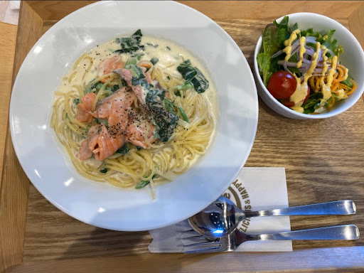 来店時間は12時ごろ。お客さんは普通に入っているという感じ。祝日だったが混んでて不愉快という感じではない。 私が行った日は子連れが多くて小さい子が美味しそうに食べてるのが可愛かった。 店員さんの対応が悪いという口コミもあったが、私はそうは感じなかった。改善されたのかな? レストランというよりは、名前の通りカフェだった。先に席を取ってレジでメニューを頼むスタイル。 食べ物の提供は注文してから15分くらい、パフェは5分くらいできた。 サーモンのクリームパスタのサラダセットを注文してみた。サーモンもたくさん乗っててクリームソースも濃厚で美味しかった。サラダのドレッシングが美味しい!このドレッシングは買って帰れるみたいだった。 連れは期間限定の春菊のパスタを注文。春菊がたくさん入っていて春菊好きの私にはとっても美味しく感じた。でも逆に春菊の味しか感じなくなってしまうかも…?でも美味しかった。 パフェはそこらへんのカフェより絶対美味しい。値段も1000円くらいするけど、入っているイチゴが全部美味しかった。ハズレがない。パフェの下に入っているムースも安っぽい感じのやつではなくて、イチゴをしっかり使っているような感じがした。 隣に直売所?みたいなところがあったので、イチゴや野菜などを買って帰れる。 立地がちょっと悪いかも…狭い道を入...