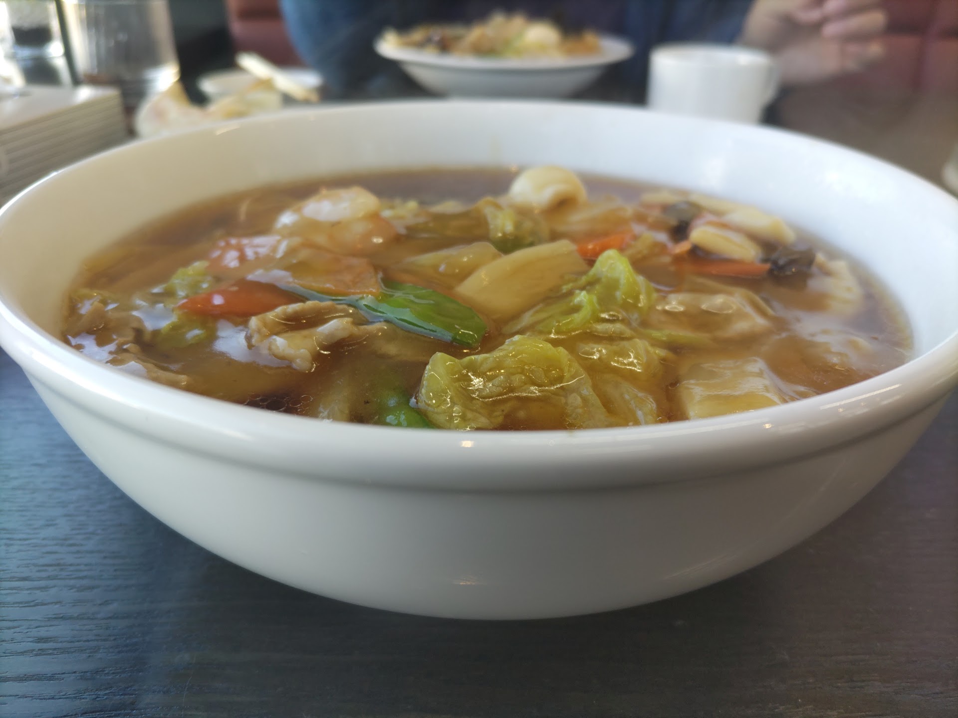 そしてメインの広東麺が到着。具材たっぷりで白菜、ニンジン、きくらげ等の野菜とお肉とエビなどが入っています。そしてこの餡のトロミがちょうどいい感じで味も抜群。ボリューミーなので大盛にしなくても充分お腹を満たしてくれます。