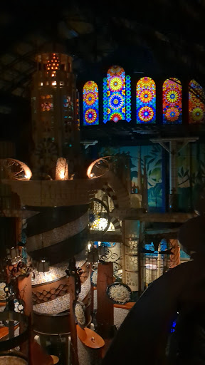 暗めの照明がまた良い雰囲気! ステンドグラスやモザイクアート、 タイル、テーブルや椅子など 全てに拘りが垣間見れます。 とても幻想的。