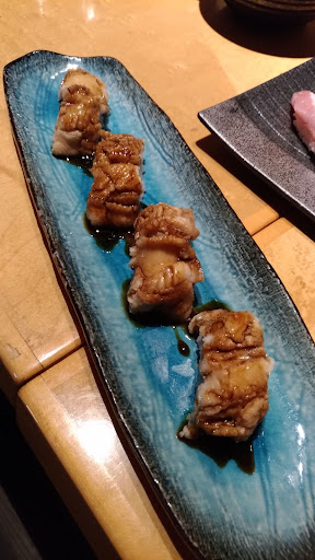 そして何と言ってもフォアグラ握り。私が寿司研に来たら100%注文する、名物メニューだ。 フォアグラ寿司は他でも食べた事がある。確かに他の店のフォアグラ寿司も美味いのだが「シャリの上にフォアグラが乗ってる」という程度。 寿司研のフォアグラ寿司は違う。まず先述のタレの完成度が重要になってくる。タレを漬けたフォアグラを、凄まじい手間をかけて炙っている。軽く炙るというレベルではない(その工程を見たことは無いが、注文から時間がかかる事から、かなりの時間をかけて炙っているものと想像している)その香ばしさたるや、、、。口に入れた瞬間、フォアグラが米ととろけあって消えていく。つまり口に入れることで、ネタとシャリ、そしてタレと炙りのクアトロマリアージュが完成する。現実、唯一無二の味である。絶対おすすめ。