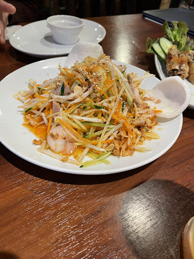 Read moreいつもとは違った異国のごはんが食べたいと主人を誘ったら、エスニック食べ慣れてなくても難易度低そうな西川口のニャウさんに連れて行ってくれました。 久しぶりの西川口は異国情緒たっぷり、てこやさんの看板にほっとします。 ニャウさんはドキドキ階段を上がった2階のお店、ドアを開けると広々とした清潔感ある店内が広がっていました。 居心地のよい4人掛けの席に通していただき、しばしメニューとにらめっこして、揚げ春巻き、海老のガーリックバター串焼き、ビーフ串焼き、バイン セオ、パッションジュースとウーロン茶をオーダーしました。 それほど待たずにまずは熱々の揚げ春巻きが到着。 皮がカリッとサクッとしていて下味ちょうどよく、そのままでめちゃめちゃ美味しいです。 豚ひき肉とキクラゲと春雨とにんじん、冷めると少し香る程度のパクチー、付属の甘酸っぱいタレや、テーブルに備付けのピリ辛のチリソースであっという間に完食してしまいました! お写真忘れてしまいましたがこのチリソースが辛過ぎず何に付けても美味しかった。 皮を剥くと湯気が立ち昇るほど熱い海老のガーリックバター串焼きはソースをたっぷり絡めていただきます。 剥いても立派な海老で甘くて美味しかったな〜。 ビーフ串焼きはスパイシーな挽肉を薄切りビーフで巻いたもの、食べ進めると辛さがじわじわきましたがパッションジュースが和らげてくれました。 最後に大きな大きなバイン セオが運ばれて来ました。 挽肉と海老ともやしとフライドオニオンと青葱の入ったバイン セオは日本人にも馴染み深い味付けで、なますとサニーレタスとパクチーとミントに生春巻きの皮まで添えられていてハサミで切って巻いて食べるようです。 生春巻きの皮がしんなりするように巻いてからちょっと置いた方が美味しかったな。 2人で一生懸命食べても食べてもバイン...