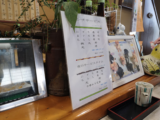 寿司屋を検索して近くをすべて廻ろうというスタイル(笑) お昼どきに伺うとカウンターには三人程座られてました。常連さんの様でしたが私が入るとすぐに僕らが出るからここ座りなよ、などと言って席をお譲りいただく。常連が新規に優しいところに悪い店はない、これは期待できそう。 ランチはすべて千円、しかも内税。ランチ握りにしました。握りはまぐろ、トロ、白身、卵、えび、いかのカズノコ和えにカッパと鉄火に漬物、つきだし?の煮物と味噌汁、食後のアイスコーヒーで1000円。 確かにネタは凄くいいとは言いがたく、玉子の巻き方もさほど上手いとは言いがたいですが1000円ですからね、充分でしょう。味噌汁、出汁がとてもよくでていて美味しい。アイスコーヒーもコクがありおや?と思うくらい美味しい。地元に根差したお寿司屋さんというかんじで...