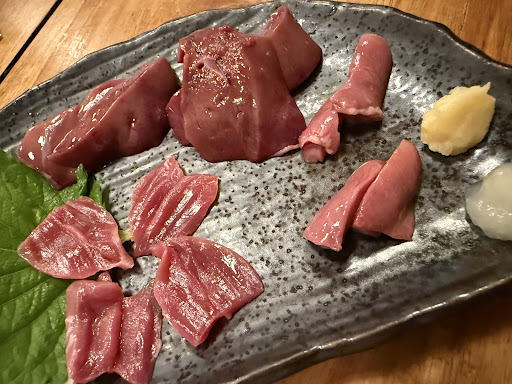 レバー、ハツ、砂肝などがきらきらと光るほど鮮度抜群。臭みゼロで、レバーはとろける甘さ、砂肝はコリッと小気味よい歯ざわり。おろし生姜&にんにくを少し乗せ、醤油でいただくと日本酒が止まりません。