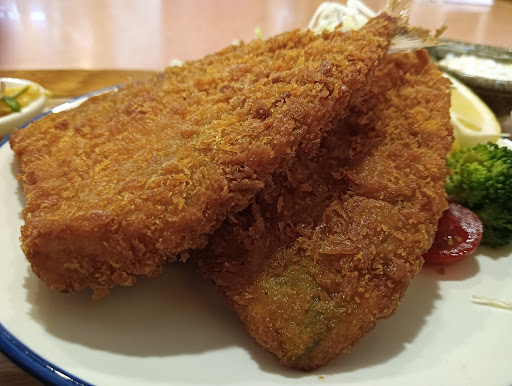 再訪記: なかなか行ける機会がなかったけど、とある土曜日の15時頃、飲食店の多くは中休みに入っている中、昼めし食いそびれていたんだけど、電話して確認すると、こちらはアイドルタイム無しの通し営業していて、しかも土曜日は17時までランチ営業しているよ、ということだったので再訪しました。 前回、目をつけていた肉厚アジフライ定食を食べてみた。 思った通り大正解でしたよ。 メニュー名に恥じない肉厚で、サイズ感もあるアジフライ2枚は揚げてサクサク&ホクホクのサクホクフライ。やっぱ旨かった~ ただ、前回と違い行った時間のせいか、ご飯がかなり残念ライスでした。 何時間保温したのだろかというパサついたご飯で、しかも下の方はなぜが塊になっていて、そいつを噛むと生炊き感のような硬さも有ったり。