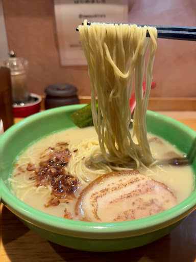 麺は細麺と太麺から選べ、細麺は博多ラーメンのような低加水の細麺でモチッとした食感。量が足りない場合は替え玉(100円)も可能。トッピングは炙ったトロトロの豚バラチャーシュー、焦がしネギ油、海苔、芋がら、赤いクコの実。メンマの代わりに甘辛く煮た芋がらが入ってるのが珍しい。全体的に油や塩分が少なめで、食後も胃が重たくならない健康的な味わい。