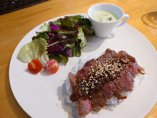 Read more隠れ家のような素敵なところでした。 入口もそうですが、店内の雰囲気もよく、テラス席もあって寛げるところです。 隣に公園があるため、窓からの風も心地よく、緑がきれいで静かでした。 メニューはドリアランチ(1,100円)、パスタランチ(1,200円)和牛ステーキランチ(1,400円)とあり、どれもスープ、サラダ、珈琲か紅茶付き。 今回は、和牛ステーキランチとシフォンケーキを頼みました。 お手頃で量もちょうどよく、お肉も柔らかくて美味しかったです。 シフォンケーキもふわふわで生クリームともよくあい、贅沢なひとときを過ごせました。 夕方までOPENされていればカフェとしても楽しめるのですが、お昼時14時までなので、そこは残念。 ただし休日の9時から11時まではモーニングをされているそうです。 オススメですが、あまり広くない店内でお昼時はほぼ満席だったので、早めに訪問したほうがいいかもしれません。 クレジ...