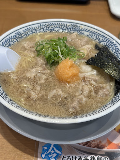 丸源ラーメンの特徴の一つしゃぶしゃぶ肉と柚子胡椒おろし!生玉ねぎとニラ、そこに唐辛子とラー油がたっぷりと🥹見た目以上に辛くはなかったですよ〜