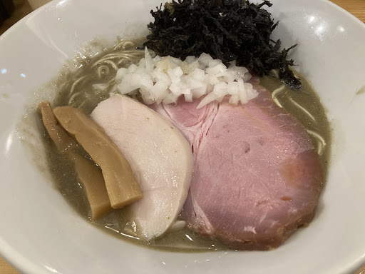 私は「濃厚煮干らーめん」にしたのですが、本格的な濃厚煮干しです。スープはやや少ないのですが粘度高めで、セメント系ではなく塩辛さも抑えられている感じで素晴らしいスープだとと思いました(とはいえ慣れてない方には相当塩辛いと感じるかと思いますのでご注意ください)そこに、菅野製麺特製の加水低めのポキポキ麺ですね。王道です。具材はアサツキ、玉ねぎ、太目のメンマ、鶏と豚のレア系チャーシュー、岩海苔といった感じです。うん。美味いですね。文句なく美味い煮干のお店だと言えます。