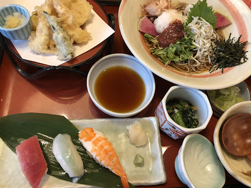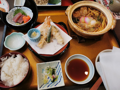 さっそくメニューをチェック。うどんやそば、天丼やうなぎ、すきやきや定食、寿司など、和食系はすべてそろっているような印象、これは迷いますね。こういう時は、ぱっと見で美味しそうと思ったものに決めることにしているので、チョイスしたのは大海老と真あなごのふわたま天丼と麺(税込1930円)。まあ、メニューに「サガミ名物」と書いてあるので選択するしかないですわね。