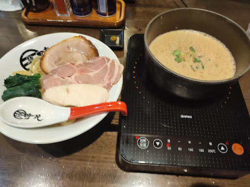 つけ麺のスープをIHで温めて食べると見かけて、ワクワクしながら注文。店主さんが初めてですか?とIHの使い方から丁寧に教えてくださった。 結果から言うと、私は大好きです。つけ麺は冷盛りだとつけ汁が冷めてしまいやすいので、他所のお店では必ず熱盛で注文するのですが、麺が柔らかくなりすぎてしまうのが難点でした。 こちらのお店ではしっかり水で締めてあるので麺のコシは残ったまま、一口目の熱々つけ汁をずっと楽しめて最高でした。チャーシューもつけ汁にちょっと沈めておくだけで熱々になり、脂がいい感じにとろけて美味しい。