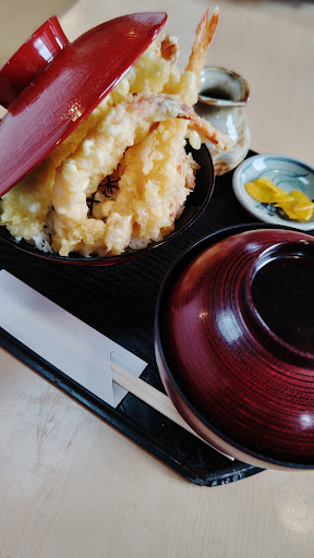 川南漁協直売所を右手に通り過ぎて、直進すること数100メートル、左巻きの登り坂手前を左側(段石と段石の間が狭いです)に入って、数十メートル。初めての方は分かりづらいかも)。この日は猛暑日で、日陰を求め橋下の駐車場へ。青空もそば近くの海の青も眩しい。 午前11時半前なのに、もう3組ほど待ち。手書きで受付し、トイレ近く(入口から左手)の座イスで。一杯の時は入口手前で座イス待ち。畳の座敷席(約10机)はすでに満席。大型バスで座敷席貸切で利用してる団体客を見かけたこともあります。カウンター(入口左は6席、中央は10席)は空いてて、後から来た二人組の親子やご夫婦がそちらを選択。抜かれた気分。 店内は、漁港が近くにあるだけに、漁にまつわる物があちこちに飾られてます。 待つこと約30分。靴を脱いで座敷へ。従業員さんが冷水、熱いお茶、醤油、刺身醤油、メニュー表、おしぼり持参。注文は、卓上タッチパネルか押しボタンで。 前回食べられなかった数量限定のレディース御膳(税込1,550円。レディースだけど、男性も注文可です)をタッチパネルでポチッと急ぎ選択して注文。以前は生玉子のサービスがあって卵かけご飯をしてたけど、なくなってました。 待つこと約15分。待ってましたぁ。20代アルバイト女性が配膳、受け取ったら、重い。思わずこんなに重いんですね。黒いトレイには、沢庵付きのご飯、お吸い物(ワカメとフ)、冷えたマグロの刺身(大根ツマにシソ、ツーンと辛みが効いた本格ワサビ)、天ぷら(シソ、エビなど。衣がちと固いような)、チキン南蛮(鶏もも肉で柔らかくジューシー!タルタルも甘くもなくバランスが丁度いい。サニーレタス敷き)、もずく酢(レモンスライスを絞って、クエン酸が染みます)、酢の物(魚フライにタマネギと人参)、サラダ(サーモン刺身とレタスのカルパッチョ)、茶碗蒸し(椎茸、かまぼこなど。柔らかくサラッと流し込んで)、デザート(ライチ3個、皮剥いて)。てんこ盛り。これをレディースと呼ぶ?男でもお腹一杯になってしまうのに。ふと思ってしまいました。 待ってる間、座敷席上を見ると、エアコンのフィン部分にカビらしきものが、そこはざんねんっ 斬り(波田陽区)。周りを見ると、子連れの家族やご年配の夫婦など年齢も幅広い方々から愛されてます 食べ物が届いて皆さんの表情も、見て満足食べて満足のご様子でした 美味しかったです、ご馳走さまでした! てんこ盛りの天丼も、大盛りにできる海鮮丼も気になって、また次回に...