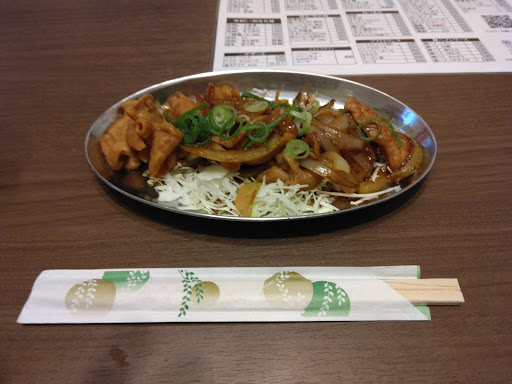 注文はトンカツ定食と豚ホルモン炒めです。豚ホルモン炒めはたまねぎの食感と甘辛醤油味でご飯が進みます。 トンカツ定食はサクサクで、つけ合わせが海老マヨと海老の唐揚げ(ガーリックシュリンプ?)で、これまたご飯が進み...