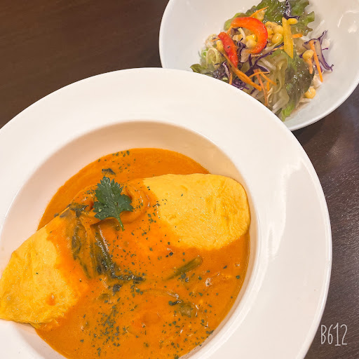 オムライスも本当に美味しかったです💕 たぶん😂コンソメで味つけられたであろう具ありの熱々ライス (結構、量が多め)が分厚い卵で包まれ… その上から物凄くおいし〜〜い 明太子クリームがたっぷりかけられて…