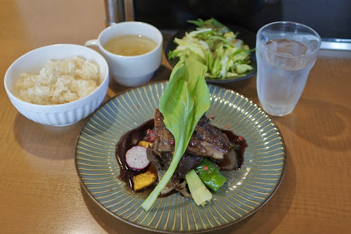 ◆鹿バラ肉の赤ワイン煮込みランチ 税込 1,300円 サラダはレタス、水菜、ベビーリーフでシャキシャキで美味しい。 スープも普通に美味しいですね。 で、メインが来たらビックリした。 わぉ〜! めっちゃテンション上がる盛り付けやんか! しかも少ないだろうと思っていたて鹿肉が予想の倍くらい乗っていてテンション爆上がり! お肉の下には色んな野菜(さつまいも、蓮根、人参、ピーマン、ジャガイモ)などがあって、魅力的すぎるよ♪ さっそく鹿肉から頂くと、めっちゃ柔らかくて赤ワインの大人なソースは旨味たっぷりで激ウマー! 赤ワインの渋みは皆無で凝縮された濃厚な旨味に溢れてます。 そして鹿肉のしっとり感、柔らかさ、繊維のほぐれる感触、全て超好み! 聞いてみたら、やっぱり大好きな蝦夷鹿だったよ♪ お野菜も赤ワインソースがめっちゃ合っていてどれも最高に美味しい。 ご飯はきぬひかりを5分精米(ごぶづき)との事。 白米が10分精米としたら5分とは胚芽も残って玄米の風味も残るくらい。 玄米は食べ辛くても5分なら食べやすくて身体に良いので大歓迎です。