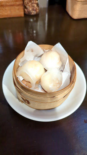 セットで頼んだエビ蒸しギョーザは、小さなセイロで供されます。見た目はギョーザというより小籠包のようです。分厚い皮が非常にモチモチしていて、中の餡にぷりっとしたエビが入っています。ただ、満足度から言うと、同じ値段のミニチャーシュー丼かシューマイにすれば良かったと思いました。