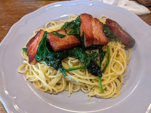 ドマイナー住宅街にあるのに、地元の人に大人気でランチ時は結構人が並んでます。 内装がイタリアンてより、アジア風でしたが、こじんまりながらも居心地◎◎ ランチセットパスタを頂きました、 この日はほうれん草&ベーコンのトマトソース。パスタはモッチリ系、 バジルが効いて、ベーコンがめっちゃ厚切りでジューシーでボリューム満点でした。