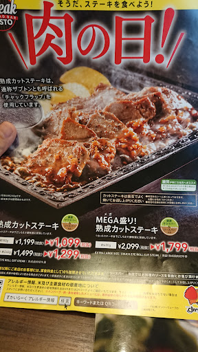 Read moreステーキガスト、近くにないので、川崎の菅生店に行ってきました。 ヒレステーキ150g食べましたが、物足りなかったので、雨の日のお得🎶チケットをアプリで貰っていたので、熟成肉のカットステーキ・160gも。 サラダバー・デザート、パン・ご飯・カレーセット付きにしてみましたが、レタスの鮮度が悪くて茶色く変色していたのが残念でした。 ステーキソース、サラダドレッシングは数種類あり、どれも(テスティングしたので)美味しかったです。 全席禁煙なのが、煙草アレルギーなので、良かったです。 いくら美味しい店でも、食事しないで、ず〜ット煙草に火をつけたまま、話し込むお客様の隣は、本当に!!迷惑なので、そう言うシチュエーションも許す喫煙の店には、二度と行きませんから、こちらは安心して家族連れ、子供や赤ちゃんも安心なお店です。 残念なのは、同じ様なステーキのファミリーレストランでは、サラダバーと同じ様に、デザートが凄く充実していて、ソフトクリームやアイスクリーム、フルーツなど、スイーツが充実しているのですが、こちらのお店は、チョコレートババロア、コーヒーゼリー、ストロベリーヨーグルトをすくって、容器に取るタイプの4種類と、黄色い果肉の瓜メロンの薄切りしかなかったのが、残念です。 子供は、むしろデザートが充実しているお店が嬉しいので。 お肉はお値段相応のお味でしたが、従業員の方々は皆さん明...
