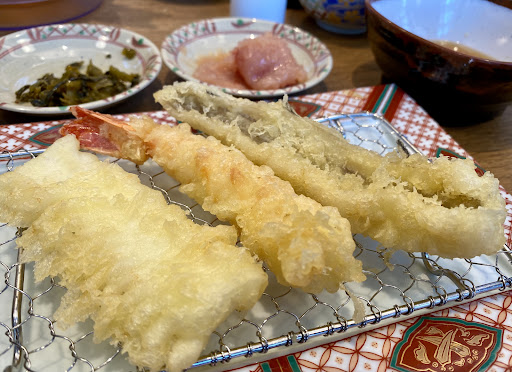 ご飯と味噌汁がつき、ご飯はおかわりできます。天ぷら用に天ツユを用意してくれますご、塩や抹茶塩で食べることもできます。全体的に良かったですが豚ロースは一口では食べきれず、噛み切るのも困難で食べにくかったです。それ以外は問題なしです。
