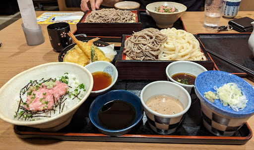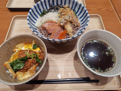 Read more近所なのでよく利用します。 尻手黒川街道沿いでこの辺り近辺はファミレスが無く貴重な存在、駐車場も広いので車利用客が多いです。 店内は、靴を脱いで銭湯風のロッキーカにしまって裸足で入る形式、半個室ブースが多くあり、普通席も掘りごたつ形式のボックステーブル席、和のテイストで統一されています。 半個室ブースが半分くらいあるので、主婦会、女子会、仲間内での打ち上げや飲み会、などの集まりでよく利用されているように思います。 注文はテーブル据え付けのタブレットにて、メニューは多様で少しお高めではありますが、蕎麦やうどんを始め、しっかり調理されていて好印象、ガッツリ系も、ヘルシー系も、楽しめます。 先日は、鴨肉とキノコ天麩羅のつけ蕎麦を頼みましたが、鴨肉はとても肉厚で、それでいてしっとりジューシーで柔らかく、舞茸とエノキの天麩羅は揚げたてサクサク、つけ汁は大根おろしを溶いてあり、非常にさっぱりかつ...