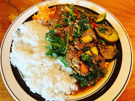 結論、めちゃウマっ!!!笑 辛さは控え目で、カレーは各スパイスからオリジナルで調合されていて、市販のルーのような味ではないです。 野菜もしめじ、キャベツ、人参2種、大葉、ナスと具沢山で栄養満点な感じ。