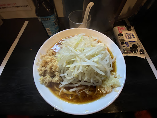 【240807】 禁断の果実(1,300円 麺半+N) 朝ラー食べたくて9時から営業している豚星。へいざ。 麺半分にしたが、相変わらず結構な量がある。 野菜少なめコールを忘れ野菜を残してしまった。 ごめんない。