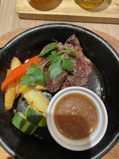 The highlight here is the craft beer menu. Although not large when compared to a "Craft beer" pub (which may have 20 or 30 craft beers on tap), there are 10 Japanese craft beers on sale here by the glass or pint. These include "weizen" and IPA styles from around Japan. If you like craft beer, note that there is a three-beer taster set available (very small glasses) for around 1,200 yen with your choice from the menu, OR (at time of writing, April 2018) a two hour all-you-can-drink option ("nomihodai" for 2,800 yen). This seems like a good deal when compared to the price of a pint, which starts at 880 yen (note however that your last order will be taken 90 minutes into your time.) Service was fast and polite, and the food tasted fine (could have been...