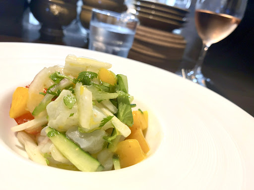 一品目はスズキとマンゴーのセビーチェ。プリッとしたスズキとトロリと甘いマンゴーをビネガーとパクチーであえてあるさっぱりとしたセビーチェは、まさに今日のような暑い蒸し蒸しとした日のためのメニュー!ドライなロゼと合わせて。体に染み渡る… パリソワール=パリの夕暮れと名のついたビシソワーズの上に帆立のタルタルとコンソメジュレを添えたスープ。甘くて濃厚、おいしすぎる。 この2品で悩んでいたらご厚意でハーフサイズで両方用意してくださいました。おひとり様に優しい…!本当にありがたいです。
