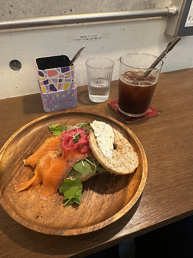 I ordered the cream cheese and smoked salmon bagel and an iced black coffee. Both were really good. The bagel was lightly toasted and the addition of pickled onion was very tasty. The coffee was a mild blend and not at all bitter.