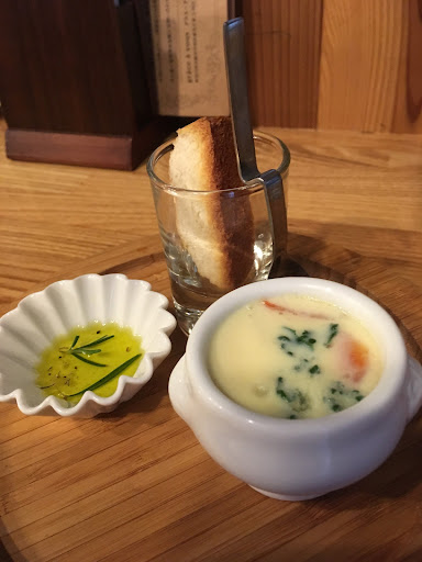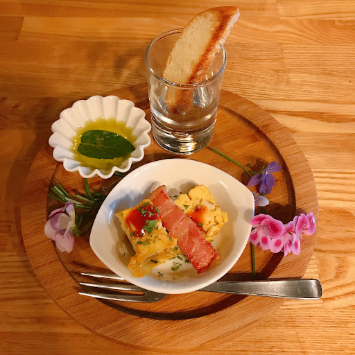 続いて、アミューズが来ました。 木製のプレートに花飾りが添えられていて、見た目も綺麗なアミューズです。 プレートには、小さな器に卵焼きやオリーブが盛られています。そしてグラスにはパンのステックが、これは添えてあるオリーブオイルに付けて食べるのでしょうか。 まずは卵焼きから。卵焼きはケチャップがかかっていていますが、ほんのり出汁の風味と共に甘みもあって美味しいですね。 その脇にある白い小さなスティックを食べてみたら梨でした。とても甘いですね。さらにその横にあるのは小さなカットの生ハム。もしかしたらさっきの梨と一緒に食べたら美味しかったのかな?でもそのままでも美味しかったです。
