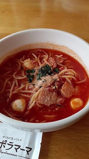 Read more市電通り沿いにあるイトーヨーカ堂川崎店の3階にあります。 雨が小降りになり始めたので、散歩がてらイトーヨーカ堂まで行き、ちょうどお昼になる頃だったのもあり入店しました。 店内はL字のような造りになっていて、2人がけ〜4人がけのテーブル席が15席弱ほどと、さほど広くはないカンジ。日曜日の11時半頃でしたが、半分くらい席が埋まっていました。 10種類ほどのパスタにスープ・サラダ・トーストのサイドメニューから一品が選べるランチメニューがあったので、そちらから吊るしベーコンと十勝産モッツァレラのマルゲリータ風スープパスタと本日のスープ、サラダほうれん草と吊るしベーコンの和風クリームパスタとミニサラダを注文。プラス¥250でドリンクバーも追加しました。 まずはミニサラダとスープが運ばれてきました。 その後10分ほどでパスタが到着。 マルゲリータ風スープパスタはにんにくの香りが食欲をそそります。ただ好みとしてはもう少し粉チーズがかかっている方が良かったかな。テーブルには調味料が一切置かれていないので、別で持ってきてもらえたら有り難かったですね。 和風クリームパスタの方は、あっさりとしたクリームがベーコンの塩味とバランスが良く美味しかったです。 ゆであげ生パスタのお店ということで、パスタの茹で具合は良かったですが、細めの麺なので食べ応えはあまりない感じ。 また、具材の量も少ないように思いました。 パスタのお店ということですが、ピザも何種類かメニューがあり、お手頃価格で美味しそうでした。 ドリンクバーの日替わり?ドリンクが、シナモンジンジャーティーだったのですが、薄い紅茶にシナモンの香りがするだけという感じで美味しくなかったです。 ...
