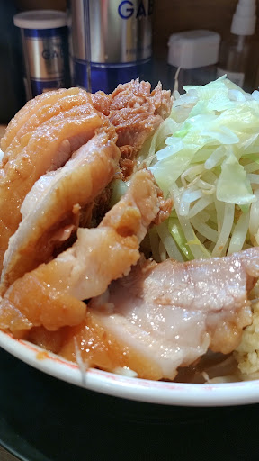 Read more2021/04/10 一年ぶりの再訪 前回がっかりした記憶があるのですが、豚を腹いっぱい食べたくなったので訪れました。 11時30分位に到着。席は満席でしたが、列はなく退店する客と入れ違いで待ちなしで着席。小ラーメンぶたダブルを注文しました。 店内では男性と外国人スタッフ2名がいましたが、男性の丁寧で元気な接客が素晴らしいですね。外国人スタッフにも優しく教えていて、J系とは思えぬ居心地の良さを感じます。 数分でトッピングを聞かれたので、今回はニンニクマシマシヤサイをオーダー。着丼してニンニクの量が凄まじく、マシマシはやりすぎだと後悔しました。マシでスプーン1杯大盛り入るんですね。 記念に写真を撮りましたが、ヤサイと豚の盛りが凄すぎて丼の中が全く見えず最高です。 とりあえず大量のヤサイを豚と一緒に食べます。箸で持つと崩れそうなくらい柔らかい豚が本当に美味い!この豚を8枚食べれるのが嬉しいですね。 豚を3枚を消費してヤサイを平らげると、スープをゴクリ。 めっちゃ美味い!!!カラメが効いていますが、脂の甘味が溶け込んだ乳化系の味がたまりません。1年前はがっかりした記憶が消え去りました。 ちょっと多すぎたニンニクをレンゲに退避して天地返し。残りの豚と一緒に一気に啜りました。食べやすい細麺なのでとても啜りやすいです。 ぶたダブルだと終盤に豚がちょっと苦しくなりましたが無事完食。 11時50分位で食べ終わりましたが、ふと後ろを見ると店の外まで列が伸びていました。12時前には外に列ができるみたいですね。 一年ぶりの再訪は大満足。☆5に変更しました。 次訪れたらニンニクを少なめにしようと思います。