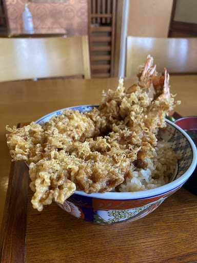 丼からはみ出す程に太くて大きすぎる2本の海老天が黄金色に輝いて見えます🤩 創業当時から使用されている天ぷら鍋で丁寧に揚げた海老天はぷりっぷりで衣の上側はサクサク、ご飯に接する下側は蒸されて柔らかくめちゃおいしい😍つゆはやや甘めでさらっとしていてご飯への染み方もちょうど良い! ごま油の香りも良く全然重くないので油へのこだわりも窺えます🥹