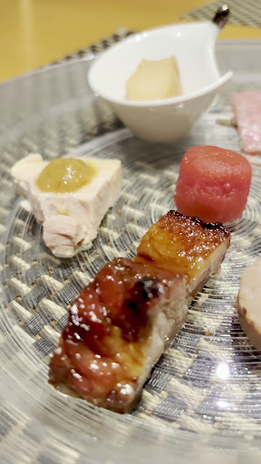 この日は、11,000円のコースに酢豚を追加しました ▶︎前菜盛り合わせ 青森240kg超本鮪/太刀魚/ 三元豚と鶏レバーのパテ/焼豚/蒸し鶏 ミニトマトの杏露酒/白子の紹興酒漬け