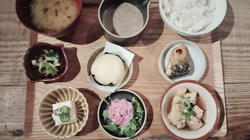 JRå·åŽé§ æ±å£ããåŸæ©çŽ5åãããããã¡ã°ãªéããé²ãã§ãæ§æ±æµ·éãšã®äº€å·®ç¹ãæž¡ã£ãŠãã峿ã®ã«ãªãšå·åŽãã«1éã«ãããŸãã éææ¥ã®ã©ã³ãã«äŒºããŸããã åºå ã¯æã£ããããåºããæšã®ã¬ãããã®ããå€å®¶é¢šãªé°å²æ°ã10æã ã£ãããšããããããŠã£ã³ã®é£Ÿãä»ãããã¡ãã¡ã«æœãããŠããŸããã å ¥ã£ãŠããå·ŠåŽã«4人æãããŒãã«åžãš6人æãããŒãã«åžãããã奥ãžé²ããšãåšæ¿åšãã«ã«ãŠã³ã¿ãŒåžã8åžããããš2人ã4人æãã®ããŒãã«åžã7åžããããããŸããå¥¥ã®æ¹ã«ã¯å°ãåºåããããããªããŒãã«åžãããã20åãããã¯åº§ãããã§ããã å°çããã®ã¯13æå°ãåãšããããšã§ãé ãã®ã©ã³ãã¿ã€ã ãªã®ããããåºå ã¯å®¶æé£ãäžçµãšãäžäººæ§ã®ã客ããã2人ã ã©ã³ãã¡ãã¥ãŒããã1çªäººæ°ã®æ°ééå®ãå±±èå±ã®æ°ãŸãã6çš®ã®ãã°ãããå®é£(ï¿¥1,300)ããšãæ¬ã®å€©ã·ãïŒãåºèº«ãšéºŠãšããã¯ãå®é£(ï¿¥1,650)ããæ³šæã ãå±±èã®å€ãæçåºããšããåºåã ããã£ãŠãã©ã®ã¡ãã¥ãŒã«ãããšããããä»ããŠããŸãããšãããèªç¶è¯ãå³åã§ãšãããé»ããšããããšå€§åèãšé·èãåºæ±ã§ãšãããçœããšãããã®ã©ã¡ãããéžã¹ãŸããå³åã§ãšããšããã®ãåããŠã ã£ãã®ãšãåºå¡ãããªã¹ã¹ã¡ãšããããšã§ãé»ããšãããã«ããŸããã ã©ã³ãã¿ã€ã æã¯ãåšæ¿åã«ãæãµããšæž©ãããè¶ãšå·ãããè¶ã眮ãããã»ã«ããµãŒãã¹ã«ãªã£ãŠããã®ã§ãã«ãŠã³ã¿ãŒåžååã䜿ããªããªã£ãŠããŸããã 5åãããã§ãæçãå°çã ãã°ãããã®æ¹ã¯é¯ã®å¡©çŒããå±±èãšé¶èã®ç ®ç©ã玫èã®ããããµã©ãããè±è ãæµ 挬ããæå€ªãšãã磯蟺æãã®ãã°ããã6çš®ãšé»ããšãããšã飯ãšãå³åæ±ãã©ããçŸå³ããã£ãã§ãããå人çã«ã¯æå€ªãšãã磯蟺æããšçŽ«èã®ãããµã©ãç¹ã«ãæ°ã«å ¥ããæ®éã®ãšããã®ç£¯èŸºæãã ãšæã£ãŠãããæå€ªåãå ¥ã£ãŠãŠçŸå³ã ã£ãã®ãšã玫èãçããŠã¹ã€ãŒãã®ããã§ããã ãåºèº«ã¯2çš®ããµã¯ãµã¯ã®å€©ã·ãã¯ãšããå«ãïŒçš®ãã©ããçŸå³ããã£ãã§ãã é»ããšããã¯ã»ãã®ãå³åã®é¢šå³ã§ããã£ãšãããªãããæã£ãããããã£ãããšé ããŸããã åºå¡ããã®æããè¯ãããäžäººæ§ã§ãå ¥ããããé°å²æ°ã§ããã£ãããšã©ã³ãã¿ã€ã ãæ¥œãããŸããã ãšã¯ãããã¿ã€ãã³ã°ã«ãã£ãŠã¯ãæŒæã¯æ··éããããã§ãããŸãã人æ°åºãªã®ã§å€ã¯äºçŽããæ¹ãè¯ãã¿ããã§ããã ...