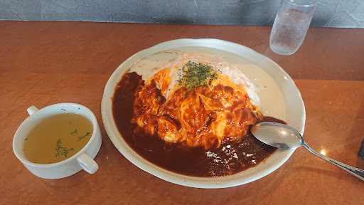 オムライスはふわとろ系 ソースはデミグラスソースとホワイトソース フワトロ玉子の下にはチーズがトロリ、 その下にはケチャップライスではなくきちんとチキンライス デミを絡めれば洋食屋の洒落たオムライス ホワイトホースを絡めればドリア風の味わいで美味いではないか