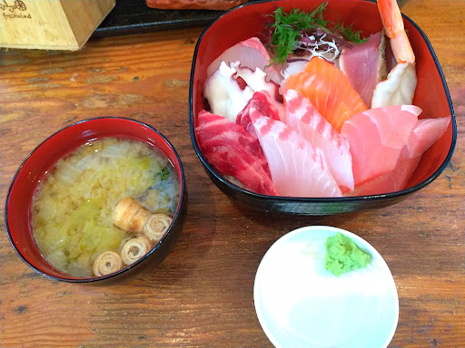 お味には満足したが、腹具合にはかなり余裕が有ったので、海鮮丼も頼んでみた。 こちらも新鮮な刺身がモリモリで大満足。 刺身の量が多くてご飯が追い付かないので、ご飯は大盛りでお願いした方が良い。 なにも言わないと普通の温かいご飯に盛られてくるので、酢飯希望の場合は注文の際に忘れずに申し出なければならない。