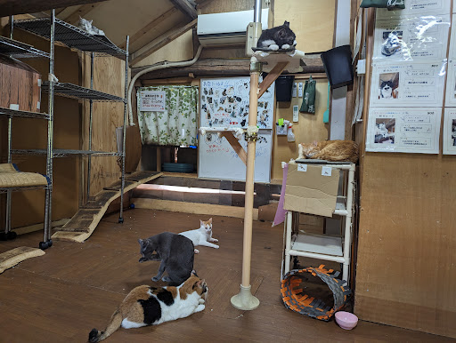 Read more野良出身のネコ好きさんには癒しの場所まちがいなしです 保護ネコメインのようなので、出来るだけのお世話を精一杯してあるのが私にはわかりました。何よりネコさん達が懐っこくて、大人しいこが多かったです。 最初は入口がちょっとわからず、ウロウロしてしまいましたが、カフェになっている一階のドアを開けて、右側へ入って行って声をかけて下さい。お母さんがいらっしゃいますので😊 そこからお食事又は喫茶を選んで、先でも後でもネコさん達と触れ合いタイム無制限です 何部屋か分けてあり、アレルギー持ちのこ、病気持ちのことかで分けてあります。私的に病気の子も人にはうつらないのでお構い無しで触れ合いますが、ネコさん的に触れ合う順番は病気の子は最後かなと思います。一人ボッチでネコエイズ持ちの子が鳴いて居たので、最後に沢山ヨシヨシして来ました。 貴重品ロッカーもあり、ネコのおもちゃや毛取りロ−ラ-、ネコブラシも一部屋取って置いてありましたので、預けて身軽に触れ合っていられましたよ とにかく、ネコが...
