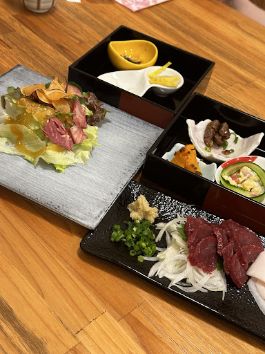 Read more赤身の馬刺しと馬ハンバーグを注文させていただきました! 子供用にと頼んだハンバーグが まさかの高級レストランでよく見るコース形式での提供だったのでしょうか?すっごく時間がかかりました笑 メインに辿り着くまで40分かかりました笑 こんなに待たされるのなら一言欲しかったです。 高評価つけてるみなさんは、お腹すいてご飯屋にきてるはずなのに40分も待たれてるのですか?すごいですね。 まさかの私たちだけこんなに待ったのでしょうか? 私たち以外に客はいなかったのですが、何をされてたのでしょう。いまだに不思議です。 ずーっと定員さん同士大きな声でとても仲良くおしゃべりされていて40分待たされてけっこーむかつきました笑 2度と来店しないです^_^ 馬刺しはクセもなく冷凍で固まった状態でお皿の上に盛り付けされていて初めての体験ばかりで非日常でした!こんなびっくりする体験もできるお店...