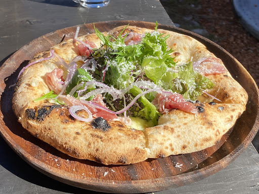 Read more日曜日の昼食に利用しました。緊急事態宣言も最終日ということで、たくさんの?お客さんでにぎわっていました。昼前に電話をしたところ、満席ですということでしたが、ついてみると少し待つと席に案内していただきました。ただし、お時間はかなり余裕をもっておいたほうが良いと思います。訪れてから30分ほどは待ったような気がします。生ハムと彩り野菜のピザを頼みましたが、二人で分けてもお腹が膨らむ量でした。ピザ一枚とサラダ一人前を二人で半分ずつにして、飲み物をそれぞれたのんでちょうど良かったように思います。ピザ窯は薪をつかったものらしく、高温でパリッと焼けていて、でも生地はもっちりした食感で、荒い小麦粉の風味と食感がよかったです。食べる場所も店内に席はありますが、屋外にもいくつかテーブルがあり、そこで自然の風に吹かれながら食べるのもいいかもしれません。ただし、私の座った椅子(丸太)はあまりクッションがなく、テーブルも多少動くので、しっかりした席とテーブルがいい人は屋内の席を選んだほうがいいと思います。テイクアウトもできますが、メニューによってはできないものもあるようです。気のおけない方と休日のランチなどにいかがでしょうか。薪割り体験ができたり、鶏のお出迎えがあったりするかもしれませんよ。美味しいピザを味わえますが、かけるタバスコに辛さが色々ありますのでよく確認す...