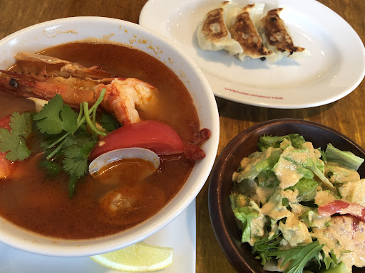 トムヤムクンヌードルランチセットを注文。 セット内容はトムヤムクンヌードルの他に餃子+サラダ+杏仁豆腐が付く。