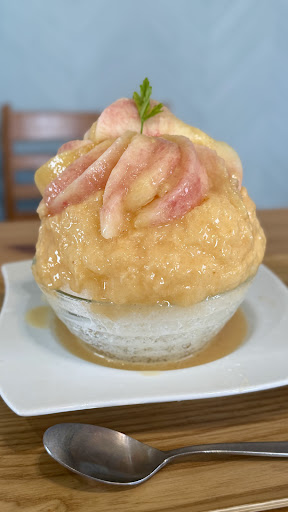 氷の表面にはたっぷりと濃厚な桃ソースが掛けられていて、上にも相当な量のカットした生桃が乗せられていて見るからに美味しそうで登場の時点でテンションが上がります