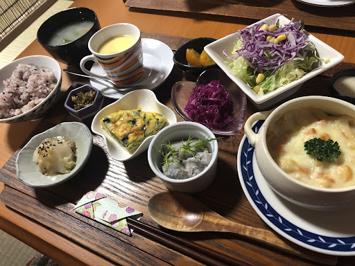 Very cute and nice place for lunch. It was all very delicious, all tastes were satisfied. Vegetables lunch set with a drink for only 900 yen. There was pasta lunch and pizza as well... The dessert was very tasty, too. We could sit at a table or on the tatami mats at a low table. The owner gave a a blanket because in December it was a bit cold in there. But the green tea offered warmed us. She also sells hand made/sewed clothes i.e. hats,...