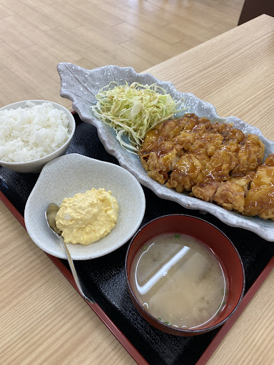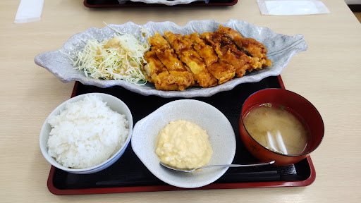 大きな衣の厚いチキンですが少しニンニクが効いており、また、黒酢でサッパリしているので味に飽きがこないです。 また、タルタルソース(お店で手作り?)も付いているので好みに応じて味が変えられます。 ご飯と味噌汁はお代わりできて、この値段はお得です。 食べきれない時は、カウンターにプラパックとビニル袋(無料)があるので持ち帰りもOKです。 ご飯をお代わりしましたが、ご飯の量も自由に変えられます。
