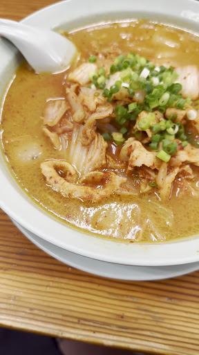 Read more一気にお客さんが押し寄せたタイミングで入店したためにあっという間に満席になり立って待つことに。相方は何度か訪れている様ですがこの店で入店待ちするなんて初めてだとの事。 数分程で案内されました。超空腹の私が頼んだのは味噌バターラーメンの大盛りとギョーザ。 メニューにはバターが乗ってるラーメンは塩味しかありませんが塩以外のラーメンでも+50円出せばバターがトッピング出来る様です。 相方からここのラーメンの大盛りは覚悟した方が良いと忠告?された通り運ばれてきたラーメンはかなりのボリュームでした。味はバターが入っているのもあって濃厚なのに面が細いコシのないストレート麺だったのでスープにマッチせずがっかりでした。 こういうラーメンには太くてコシのある麺とかもっちりしたちぢれ麺が合うと思います。チャーシューも微妙。ギョーザは私の好きな羽根付きで個数も多くて良かったのですが味付けが薄味で物足りなく感じました。タレにコショウにラー油もがっつり付けて食べる方には良いのかもしれません。 唯一良かったのはお漬け物ですね。一見赤くて辛そうに思えますしほんのり辛味は有りますが辛いものが苦手な私でもお代わりして食べました。 今度来る事があれば細いストレート麺なので塩ラーメンにしようかな?。 あと使用済みのティッシュは店内のゴミ箱にセルフで捨...