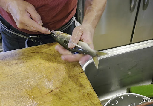 どうしても泳いでる天然鮎の塩焼きが食べたくて、店主にダメ元で無理をお願いしたら、鮎を焼いて貰えることに この鮎はサイズがまちまちで、今回は大きいサイズ(800円)でお願いしました 天然鮎も手際よく串を刺して塩を振って焼かれていきます