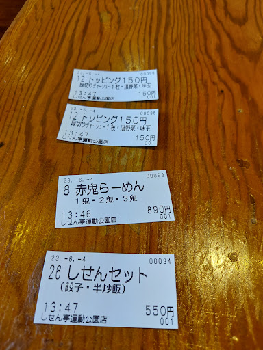 今回はしせんラーメン、炒飯、ミニ麻婆丼と餃子を注文、 このご時世嬉しい麺大盛り無料! しせんラーメンのスープは醤油、塩、味噌から選べます。