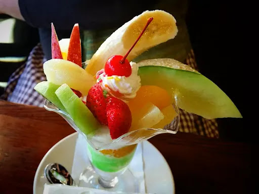 今回は15時に二人で訪れてお茶しました。 🌿フルーツパフェ🌿フルーツ餡蜜 🌿エスプレッソ珈琲🌿アイスココア