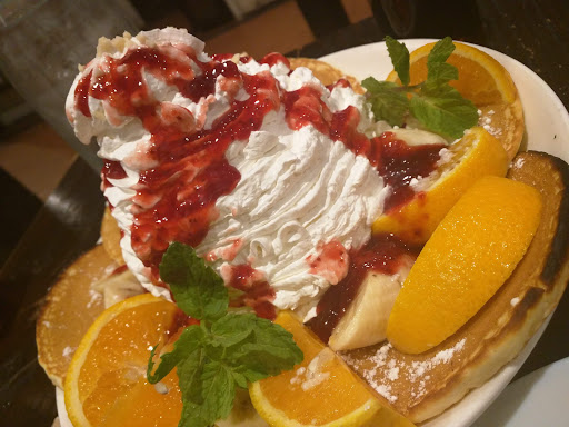 Read moreスペシャルパンケーキを食べくて伺いました。 完全にナメてました、(すっげー旨そー!余裕で食えるー!)と思ってましたが、食べ進めていくと結果無理でした、二人で食べて無理でした。 こぶし1つ強分位残してしまいましたすいません。 直径10センチ位の薄めのパンケーキ8枚くらいにオレンジ、バナナがトッピングしてありそこにハンドボールサイズのホイップクリームがズドンといった感じでした。 パンケーキは周りがカリッとしててふわふわで美味しかったのですがやはりクリームって強敵でした。レギュラーを頼んだんですがハーフでもそこそこでかいみたいなんでハーフで良かったです。