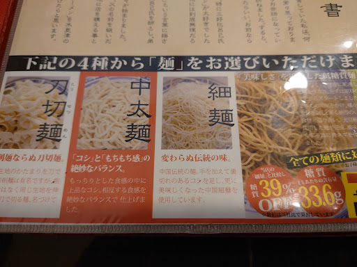 麺は、細麺(揚州商人の柳麺)、中太麺(揚州商人の揚州麺)、刀切麺(とうせつめん)という刀削麺をイメージした極太麺、そして健康志向もあってか、大豆を使った低糖質麺から選べるようになっています。今回は中太麺をオーダー。