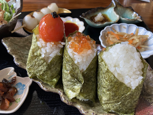 今日の「日替わりおにぎり定食」は 卵黄キャビア載せ・明太子・のどぐろ塩の3種。